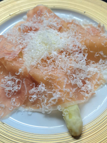 白アスパラと生ハム、温泉卵